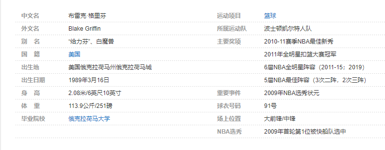 布雷克-格里芬(Blake Griffin),1989年3月16日出生于美国俄克拉何马州俄克拉荷马城(Oklahoma City, Oklahoma),美国职业篮球运动员,司职大前锋/中锋,效力于NBA波士顿凯尔特人队。布雷克-格里芬2009年以选秀状元身份进入NBA,因伤导致新秀赛季推迟了一年,后曾效力于快船队、活塞队、篮网队和凯尔特人队。2019年福布斯100名人榜,布雷克-格里芬排名第91位。