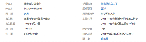 德安吉洛-拉塞尔(D'Angelo Russell),1996年2月23日出生于美国肯塔基州路易斯维尔(Louisville, KY),美国职业篮球运动员,司职控球后卫/得分后卫,效力于NBA洛杉矶湖人队。于2015年以选秀榜眼身份进入NBA,先后效力于湖人队、篮网队、勇士队以及森林狼队。