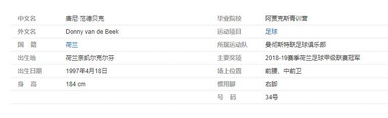唐尼·范德贝克(Donny van de Beek ),1997年4月18日出生于荷兰奈凯尔克尔芬,荷兰足球运动员,司职前腰/中前卫,现效力于英格兰足球超级联赛的曼彻斯特联足球俱乐部。个人简介: