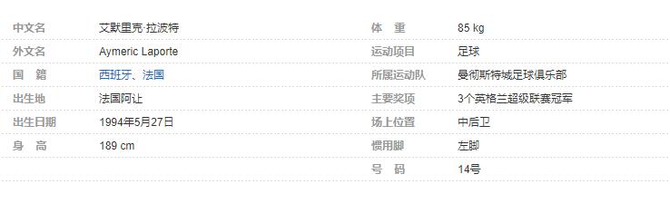艾默里克·拉波特(Aymeric Laporte),全名艾默里克·让·路易·热拉尔·阿方斯·拉波特(Aymeric Jean Louis Gérard Alphonse Laporte),1994年5月27日出生于法国阿让,拥有法国和西班牙双重国籍,西班牙足球运动员,司职中后卫,现效力于英格兰足球超级联赛的曼彻斯特城足球俱乐部。个人简介: