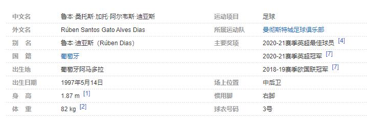 鲁本·迪亚斯(Rúben Dias),全名鲁本·桑托斯·加托·阿尔韦斯·迪亚斯(Rúben Santos Gato Alves Dias),1997年5月14日出生于葡萄牙阿马多拉,葡萄牙足球运动员,场上司职中后卫,现效力于英格兰足球超级联赛的曼彻斯特城足球俱乐部。个人简介: