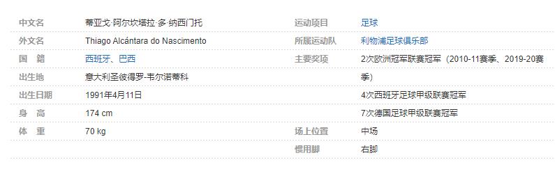 蒂亚戈·阿尔坎塔拉·多·纳西门托(Thiago Alcántara do Nascimento),昵称蒂亚戈(Thiago),1991年4月11日出生于意大利圣彼得罗-韦尔诺蒂科,拥有西班牙/巴西双重国籍,西班牙足球运动员,场上司职中场,效力于英格兰足球超级联赛的利物浦足球俱乐部。个人简介: