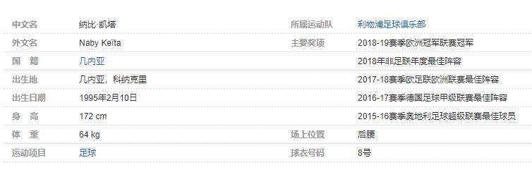 纳比·凯塔(Naby Keïta),全名纳比·莱厄·凯塔(Naby Leye Keïta),1995年2月10日出生于几内亚首都科纳克里,几内亚足球运动员,场上司职后腰,效力于英超的利物浦足球俱乐部 。个人简介:
