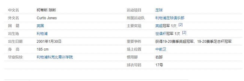 柯蒂斯·琼斯(Curtis Jones),2001年1月30日出生于英格兰利物浦,英格兰足球运动员,场上司职中前卫,现效力于英超的利物浦足球俱乐部。个人简介: