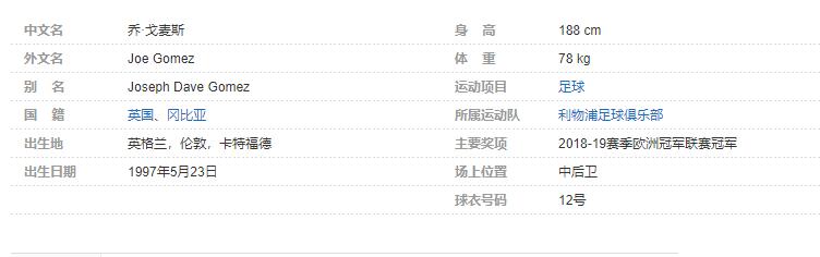 乔·戈麦斯(Joe Gomez),全名:约瑟夫·戴夫·戈麦斯(Joseph Dave Gomez),1997年5月23日出生于英国首都伦敦,英格兰足球运动员,场上司职中后卫,效力于英超的利物浦足球俱乐部 。个人简介: