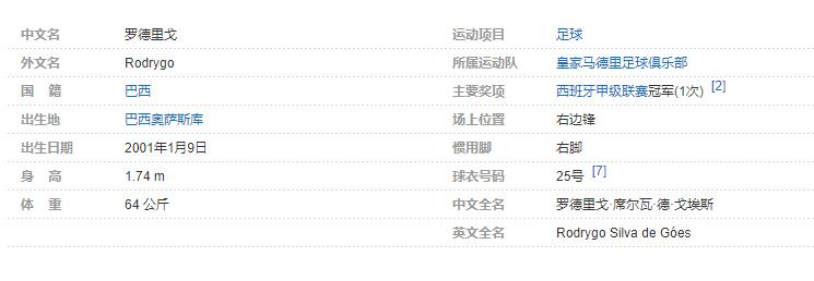 罗德里戈(Rodrygo),全名罗德里戈·席尔瓦·德·戈埃斯(Rodrygo Silva de Góes),2001年1月9日出生于巴西奥萨斯库,巴西足球运动员,司职右边锋,现效力于西班牙足球甲级联赛的皇家马德里足球俱乐部。 个人简介