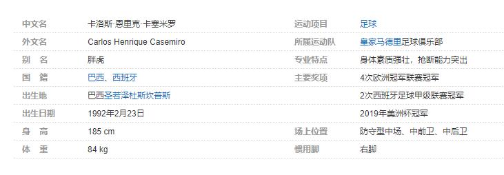 卡洛斯·恩里克·卡塞米罗(Carlos Henrique Casemiro),昵称卡塞米罗(Casemiro),1992年2月23日出生于巴西圣若泽杜斯坎普斯,巴西足球运动员,场上司职中场,现效力于西班牙足球甲级联赛的皇家马德里足球俱乐部。个人简介