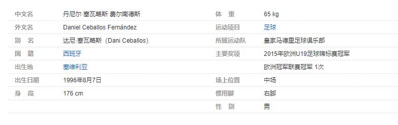 丹尼尔·塞瓦略斯·费尔南德斯(Daniel Ceballos Fernández),简称“达尼·塞瓦略斯”(Dani Ceballos),1996年8月7日出生于西班牙塞维利亚,西班牙足球运动员,司职中场,效力于西甲联赛的皇家马德里足球俱乐部。个人简介
