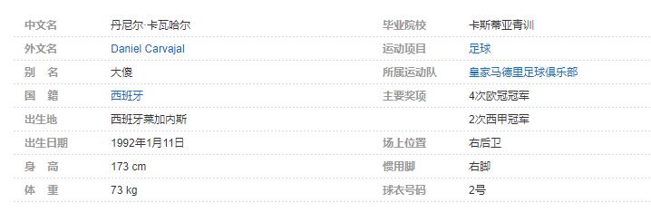 丹尼尔·卡瓦哈尔(Daniel Carvajal),全名丹尼尔·卡瓦哈尔·拉莫斯(Daniel Carvajal Ramos),1992年1月11日出生于西班牙莱加内斯,西班牙足球运动员,场上司职右后卫,现效力于西甲的皇家马德里足球俱乐部。个人简介