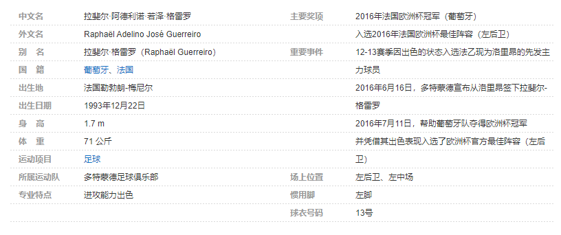 拉斐尔·格雷罗生于1993年12月22号,葡萄牙足球职业运动员,目前效力于德甲俱乐部多特蒙德。