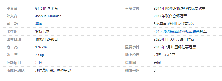 约书亚·基米希(Joshua Kimmich),1995年2月8日出生于德国罗特韦尔,德国足球运动员,场上司职后腰/右后卫,现效力于德国足球甲级联赛的拜仁慕尼黑足球俱乐部。个人简介