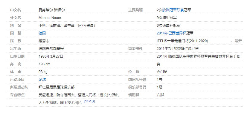 曼努埃尔·诺伊尔,1986年3月27日出生于德国北威州鲁尔区的盖尔森基兴,德国足球运动员,司职守门员,效力于拜仁慕尼黑足球俱乐部,亦任德国国家队门将。