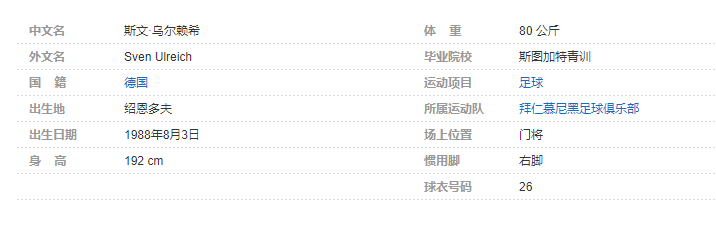 斯文·乌尔赖希(Sven Ulreich),1988年8月3日出生于德国绍恩多夫,德国男子职业足球运动员,场上司职门将,现效力于德国足球甲级联赛的拜仁慕尼黑足球俱乐部。个人简介