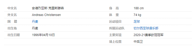安德烈亚斯·克里斯滕森(Andreas Christensen),1996年4月10日出生于丹麦,丹麦职业足球运动员,司职中后卫,现效力于英超切尔西足球俱乐部。