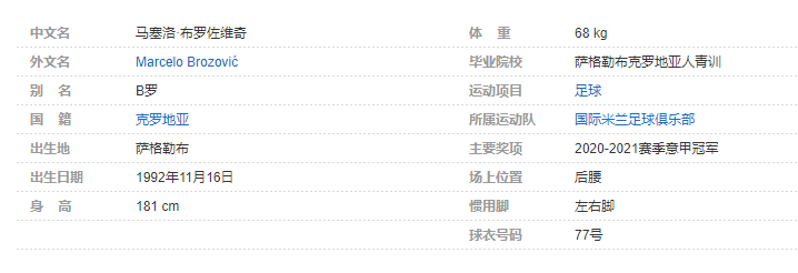 马塞洛·布罗佐维奇(Marcelo Brozović),1992年11月16日出生于克罗地亚萨格勒布,克罗地亚足球运动员,场上司职后腰,现效力于意甲的国际米兰足球俱乐部。个人简介
