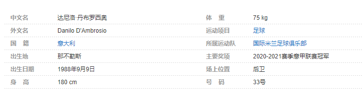 达尼洛·丹布罗西奥(Danilo D'Ambrosio),1988年9月9日出生于意大利那不勒斯,意大利职业足球运动员,司职右后卫,效力于意大利足球甲级联赛国际米兰足球俱乐部。2020-2021赛季,丹布罗西奥帮助国际米兰夺得意甲冠军。