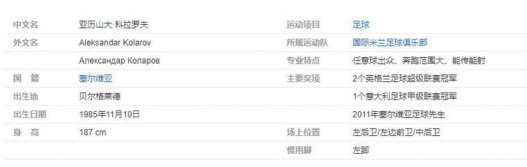 亚历山大·科拉罗夫(英语:Aleksandar Kolarov/塞尔维亚语:Александар Коларов),1985年11月10日出生于南斯拉夫社会主义联邦共和国首都贝尔格莱德,塞尔维亚职业足球运动员,司职左后卫/左边前卫/中后卫,效力于国际米兰足球俱乐部。个人简介