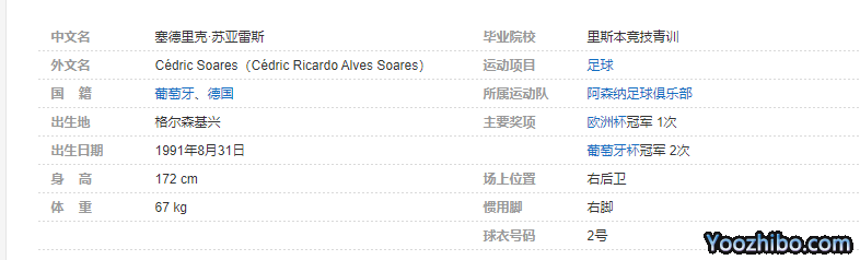 塞德里克·苏亚雷斯(Cédric Soares),全名塞德里克·里卡多·阿尔维斯·苏亚雷斯(Cédric Ricardo Alves Soares),1991年8月31日出生于德国格尔森基兴,拥有葡萄牙和德国双重国籍,葡萄牙职业足球运动员,场上司职右后卫,现效力于英超的阿森纳足球俱乐部。个人简介