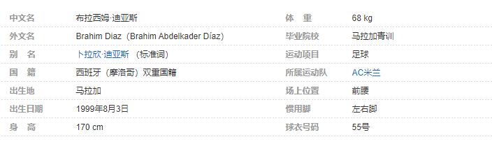 布拉西姆·迪亚斯(Brahim Diaz),全名:布拉西姆·阿卜杜勒卡德尔·迪亚斯(Brahim Abdelkader Díaz),1999年8月3日出生于西班牙马拉加,西班牙足球运动员,场上司职前腰或者边前卫,现效力于意甲的AC米兰足球俱乐部。个人简介