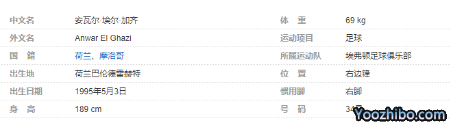 安瓦尔·埃尔·加齐(Anwar El Ghazi),1995年5月3日出生于荷兰巴伦德雷赫特,荷兰足球运动员,司职右边锋,现效力于英格兰足球超级联赛的埃弗顿足球俱乐部。个人简介