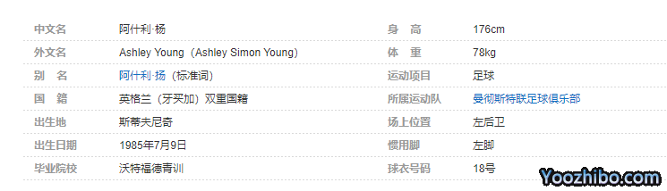 阿什利·杨(Ashley Young),1985年7月9日出生于英格兰斯蒂夫尼奇,英格兰职业足球运动员,场上司职左后卫,现效力于英超的曼彻斯特联足球俱乐部。