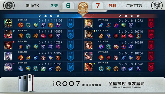 双方常规开局。1分08秒广州TTG拿下中路河道之灵。1分20秒佛山GK反掉敌方蓝BUFF。1分51秒佛山GK对抗路击杀东皇太一拿到一血。3分13秒佛山GK野区击杀露娜。3分59秒发育路团战佛山GK打出0换4。5分52秒佛山GK发育路击杀东皇太一。7分09秒双方中路1换1。7分25秒佛山GK拿下主宰。8分43秒佛山GK野区击杀东皇太一。8分58秒佛山GK摧毁敌方中路高地塔。9分23秒佛山GK拿下暴君。10分13秒广州TTG摧毁敌方对抗路二塔。10分27秒对抗路团战佛山GK打出1换3。10分59秒佛山GK拿下暗影主宰。11分54秒佛山GK发育路击杀东皇太一。12分04秒佛山GK摧毁敌方发育路高地塔。12分41秒佛山GK拿下暗影暴君。13分12秒对抗路团战佛山GK打出0换5。13分41秒佛山GK摧毁敌方水晶拿下比赛。
