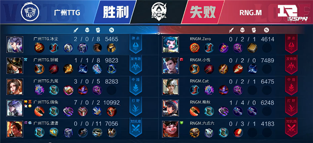 开局RNG.M中路和发育路换线,吕布入侵野区反下蓝buff。2分12秒镜拿下暴君。2分43秒镜反下蓝buff。2分54秒橘右京拿下主宰。4分35秒RNG.M推掉下路一塔,虞姬拿下一血。6分47秒公孙离推掉上路一塔。6分54秒镜拿下暴君。9分10秒姜子牙推掉中路一塔。10分30秒镜拿下暴君,橘右京拿下主宰。10分53秒中路团战,太乙真人被击杀。11分42秒广州TTG强攻上路二塔,虞姬被击杀。12分15秒RNG.M推掉中路一塔。13分10秒中路二塔处团战,RNG.M打出0换2,镜拿下双杀。14分52秒镜拿下主宰。15分14秒橘右京拿下暴君,同时自己被击杀。15分55秒RNG.M推掉下路高地塔。16分24秒中路二塔处团战,姜子牙被击杀。17分24秒RNG.M推掉上路高地塔。19分17秒镜拿下主宰。19分23秒野区团战公孙离被击杀。20分30秒暴君团,广州TTG打出1换2,虞姬拿下双杀。22分钟中路团战,RNG.M打出0换2。22分39秒RNG.M推掉中路高地塔。22分46秒,RNG.M攻破水晶拿下本局比赛。