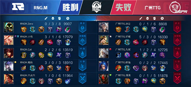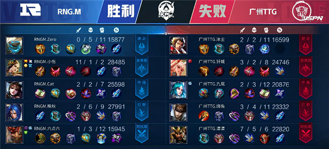 双方中路和边路换线开局。3分钟RNG.M拿下暴君,双方团战广州TTG打出0换2,张飞拿下一血。5分30秒广州TTG强攻中路一塔,双方打出2换2。6分51秒广州TTG推掉下路一塔。7分55秒虞姬推掉上路一塔。8分12秒中路团战,广州TTG打出0换3,关羽拿下双杀。9分17秒赵云拿下主宰。10分20秒中路下河道团战,双方打出二换二。12分28秒赵云拿下暴君。12分43秒广州TTG推掉中路一塔。13分57秒广州TTG推掉中路二塔。14分50秒橘右京被击杀。15分26秒貂蝉被击杀,15分30秒中路高地塔被破。15分35秒广州TTG强攻水晶,RNG.M打出2换4。17分40秒RNG.M推掉中路一塔。19分钟野区团战,双方打出1换1。21分45秒RNG.M拿下风暴龙王。22分36秒RNG.M推掉下路二塔。27分钟RNG.M推掉中路二塔。27分48秒橘右京被击杀。28分钟野区团战,张飞被击杀。31分钟中路团战,RNG.M打出0换2。32分15秒橘右京拿下风暴龙王。33分33秒虞姬推掉下路高地塔,33分45秒RNG.M再次推掉中路高地塔。34分55秒RNG.M推掉上路高地塔。36分20秒中路上河道团战,RNG.M打出1换2,虞姬拿下双杀。37分22秒RNG.M强攻水晶拿下本场比赛胜利。