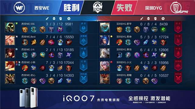 双方和平开局,3分46秒深圳DYG拿下第一条暴君,西安WE拿下先知主宰。4分33秒中路团深圳DYG鲁班大师击杀刘禅拿下一血,5分01秒深圳DYG拆掉西安WE下路一塔。6分钟上路团双方1换1,6分38秒西安WE不知火舞双杀,8分11秒西安WE拿下先知主宰。10分30秒暴君团西安WE打出0换4,11分10秒西安WE拿下暗影暴君。12分46秒深圳DYG击杀不知火舞,13分30秒上路团深圳DYG双方1换1,深圳DYG拆掉西安WE上路二塔。15分49秒深圳DYG拿下暗影暴君,16分25秒深圳DYG拆掉西安WE下路二塔。17分33秒西安WE拿下暗影主宰,20分钟下路团战深圳DYG打出0换3。20分41秒深圳DYG拆掉西安WE下路高地,22分钟团战深圳DYG打出2换4,狄仁杰拿到四杀。23分钟深圳DYG击杀不知火舞团灭西安WE,一波拆掉其水晶拿下胜利。