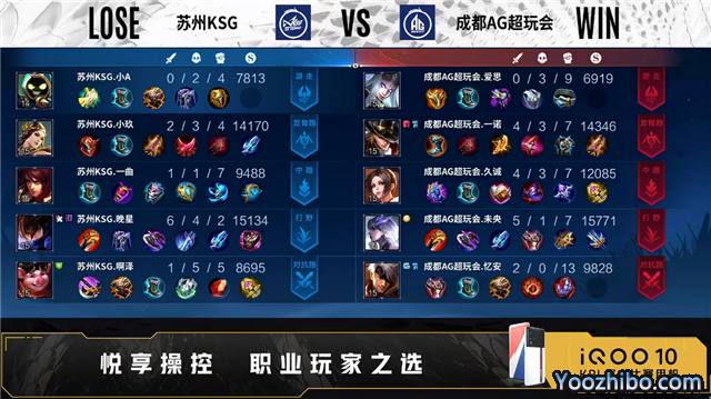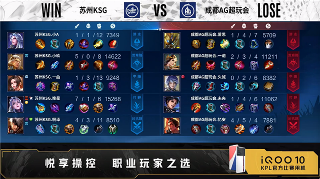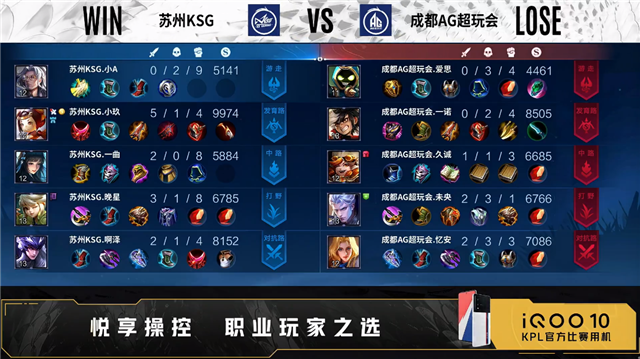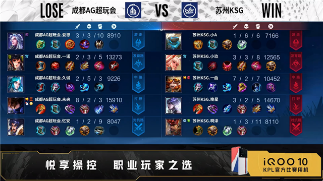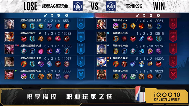 开局成都AG入侵野区双方打野1换1,苏州KSG反掉敌方蓝BUFF整片野区。2分24秒成都AG野区击杀猪八戒。4分12秒苏州KSG发育路虞姬单杀马可波罗,成都AG野区打出0换2。6分17秒苏州KSG野区击杀东皇太一,成都AG摧毁敌方对抗路二塔。6分46秒中路团战成都AG打出1换2。10分20秒野区团战成都AG打出0换2。12分50秒成都AG摧毁敌方中路高地塔。13分07秒苏州KSG发育路打出0换2。15分09秒成都AG拿下暗影主宰。16分47秒成都AG摧毁敌方发育路、对抗路高地塔。17分21秒高地团战苏州KSG打出1换2。18分48秒成都AG打出2换5。18分59秒成都AG摧毁敌方水晶拿下比赛。