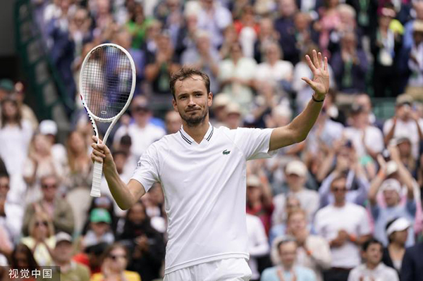 24直播网讯 北京时间7月5日,2023温布尔登网球锦标赛展开第三比赛日的争夺。在一场男单首轮较量中,赛会3号种子梅德韦杰夫迎战持外卡出战的本土小将费里。最终俄罗斯名将以7-5/6-4/6-3击败对手,成功打进32强!