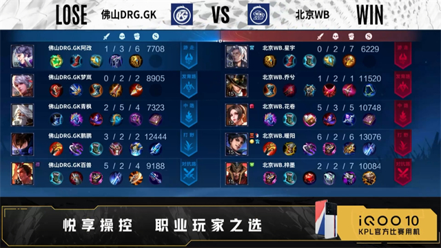 开局双方正常抢线。1分55秒主宰处佛山DRG.GK击杀夏洛特,拿下一血,马超三连决胜,打出1换4。4分37秒发育路佛山DRG.GK击杀鲁班七号,打出0换2,摧毁敌方发育路外塔,北京WB摧毁敌方对抗路外塔。5分08秒中路北京WB击杀鬼谷子,打出1换1。5分42秒佛山DRG.GK拿下主宰,北京WB拿下暴君。6分28秒野区北京WB夏洛特二连击破,打出0换2。7分47秒佛山DRG.GK摧毁敌方对抗路外塔、中路外塔。8分42秒对抗路佛山DRG.GK击杀鲁班七号,摧毁敌方对抗路二塔。9分41秒野区团战佛山DRG.GK击杀夏洛特,北京WB鲁班七号二连击破,打出1换3,拿下暴君。12分31秒北京WB夏洛特二连击破,打出0换4,摧毁敌方中路二塔、中路高地,击杀阿古朵,团灭对手摧毁水晶拿下比赛。