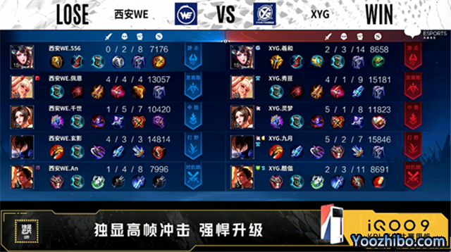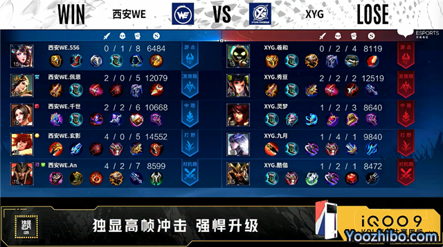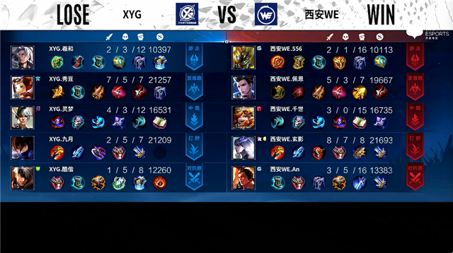 双方常规开局。2分22秒XYG发育路击杀鲁班七号。4分29秒发育路团战XYG打出0换2。4分40秒XYG摧毁敌方发育路外塔。5分27秒XYG对抗路击杀曜。5分44秒XYG摧毁敌方对抗路外塔。6分54秒中路团战XYG打出0换2。7分57秒XYG发育路击杀云缨。8分29秒发育路团战西安WE打出1换3。10分17秒XYG击杀云缨并摧毁敌方中路外塔。11分27秒XYG中路击杀曜。11分52秒XYG拿下暗影主宰。12分12秒XYG摧毁敌方对抗路二塔。12分45秒双方中路1换1,XYG摧毁敌方中路二塔。13分02秒XYG野区击杀云缨。13分34秒XYG主宰处击杀曜。14分08秒XYG击杀云缨并摧毁敌方对抗路高地塔。14分38秒XYG拿下暗影暴君。15分11秒XYG中路打出0换2。15分19秒XYG团灭对手摧毁水晶拿下比赛。