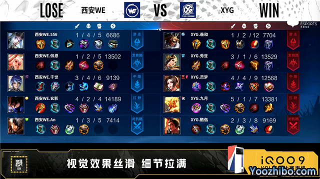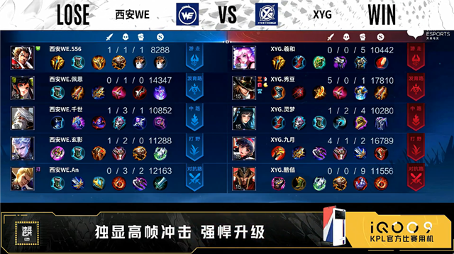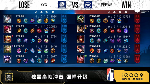 双方常规开局,西安WE中路击杀嬴政拿到一血。2分16秒西安WE拿下暴君。5分48秒双方边路外塔互换。6分19秒野区双方1换1。6分46秒西安WE发育路击杀鲁班七号。8分05秒西安WE中路击杀吕布。8分16秒双方中路1换1。9分34秒XYG摧毁敌方中路外塔。10分09秒中路团战XYG打出1换3。12分20秒XYG摧毁敌方中路二塔。12分53秒西安WE击杀澜并拿下暗影暴君。13分26秒西安WE摧毁敌方发育路外塔。14分02秒西安WE击杀澜并摧毁敌方对抗路二塔。15分49秒西安WE摧毁敌方发育路二塔。16分02秒西安WE发育路击杀鲁班大师。16分41秒西安WE拿下暗影暴君。17分27秒双方高地1换1,西安WE摧毁敌方对抗路高地塔。17分53秒双方野区1换1。19分33秒中路团战双方1换1,西安WE摧毁敌方中路二塔。20分33秒中路团战双方2换2。23秒03秒龙王处团战XYG打出2换3。23分39秒XYG拿下风暴龙王。25分33秒XYG摧毁敌方发育路高地塔。26分52秒XYG野区击杀镜。27分34秒双方中路1换1。29分15秒野区团战西安WE打出0换3。29分50秒西安WE团灭对手摧毁水晶拿下比赛。