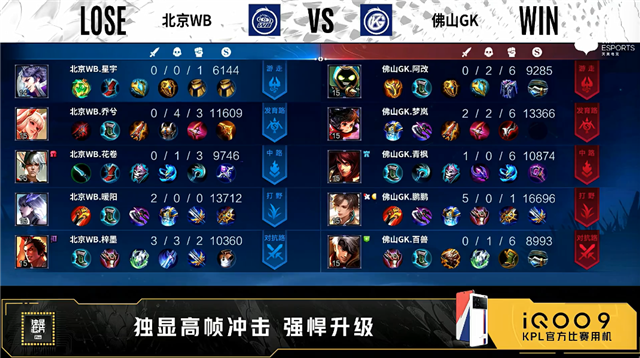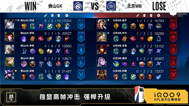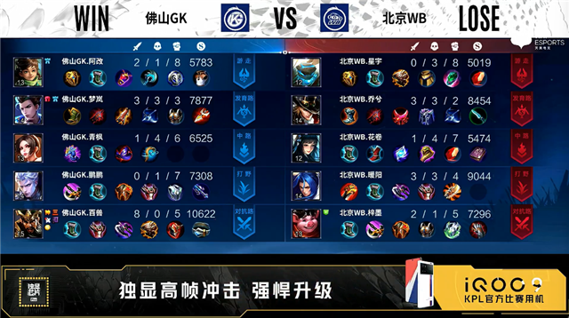 双方常规开局。2分22秒佛山GK对抗路击杀蒙恬拿到一血。2分48秒佛山GK野区击杀周瑜。3分35秒北京WB发育路打出0换2。4分32秒佛山GK摧毁敌方发育路外塔。4分38秒佛山GK拿下主宰。8分48秒北京WB摧毁敌方中路外塔。8分59秒北京WB拿下主宰。10分42秒北京WB拿下暗影暴君。11分10秒北京WB暴君处击杀东皇太一。12分10秒北京WB拿下暗影主宰。12分39秒佛山GK中路击杀露娜。16分47秒北京WB拿下暗影主宰。18分12秒北京WB击杀阿古朵并摧毁发育路高地塔。19分12秒北京WB拿下暗影暴君。20分24秒北京WB主宰处击杀马超。20分57秒北京WB拿下风暴龙王。22分14秒北京WB摧毁敌方对抗路高地塔。22分41秒高地团战佛山GK打出0换5。23分41秒佛山GK摧毁敌方中路、对抗路高地塔。26分37秒佛山GK拿下风暴龙王。27分49秒佛山GK摧毁敌方发育路高地塔。28分13秒佛山GK摧毁敌方水晶拿下比赛。