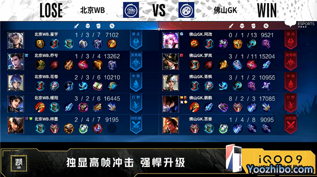 双方常规开局。3分05秒北京WB对抗路击杀太乙真人拿到一血。3分32秒北京WB拿下暴君。4分58秒发育路团战双方射手互换。6分18秒佛山GK发育路击杀公孙离。7分49秒佛山GK拿下暴君,团战佛山GK击杀吕布。10分45秒佛山GK拿下暗影主宰,北京WB拿下暗影暴君。11分18秒野区团战北京WB打出1换2。12分46秒佛山GK摧毁敌方中路外塔。13分02秒佛山GK摧毁敌方对抗路二塔。14分42秒佛山GK拿下暗影主宰。15分52秒佛山GK拿下暗影暴君。16分32秒佛山GK中路击杀公孙离。17分05秒佛山GK摧毁敌方中路二塔。17分17秒佛山GK摧毁敌方对抗路高地塔。18分28秒佛山GK拿下暗影主宰。19分29秒高地团战佛山GK打出0换3。19分45秒佛山GK摧毁敌方水晶拿下比赛。