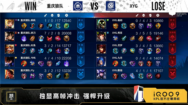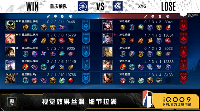双方常规开局。1分14秒重庆狼队中路击杀太乙真人拿到一血。1分30秒XYG野区打出1换2。3分11秒重庆狼队拿下暴君。3分34秒重庆狼队发育路击杀孙尚香。4分36秒野区团战XYG打出1换2。5分45秒XYG对抗路击杀蒙犽。6分40秒重庆狼队中路击杀孙尚香。10分44秒重庆狼队中路击杀橘右京。11分10秒中路团战XYG打出0换3。11分31秒XYG摧毁敌方中路外塔。12分42秒XYG对抗路击杀吕布。13分03秒XYG摧毁敌方对抗路外塔。14分20秒XYG拿下暗影主宰。15分34秒XYG对抗路击杀澜。15分52秒XYG拿下暗影主宰。16分45秒XYG摧毁敌方中路高地塔,团战重庆狼队打出0换3。18分21秒重庆狼队拿下暗影暴君。19分53秒野区团战重庆狼队打出0换2。22分11秒重庆狼队摧毁敌方中路、发育路高地塔。24分18秒发育路团战重庆狼队打出0换2。24分40秒重庆狼队拿下风暴龙王。25分40秒重庆狼队摧毁敌方对抗路高地塔。26分15秒重庆狼队团灭对手摧毁敌方水晶拿下比赛。