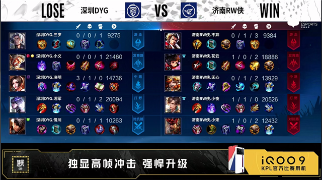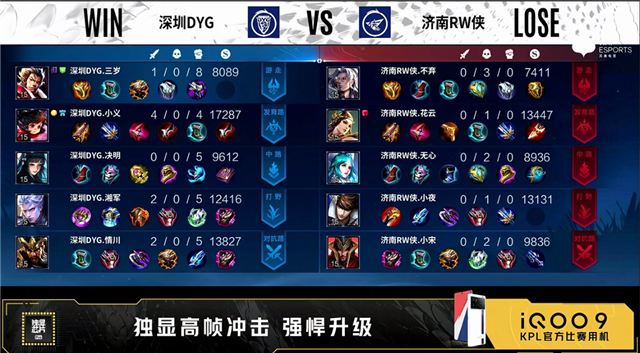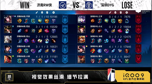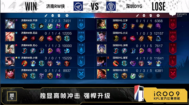 54秒,上路团,双方1换1。2分19秒,深圳DYG拿下暴君。3分钟,上路团,双方打出1换1。3分15秒,济南RW侠下路击杀周瑜,随后深圳DYG破掉济南RW侠上一塔。4分10秒,深圳DYG拿下先知主宰。5分钟,下路团,双方1换1。5分28秒,深圳DYG破掉济南RW侠下一塔。6分钟,济南RW侠破掉深圳DYG下一塔。6分20秒,中路团,深圳DYG打出1换2,随后控下暴君。7分42秒,深圳DYG破掉济南RW侠中一塔。8分钟,济南RW侠先后破掉深圳DYG上二塔和中一塔。8分28秒,济南RW侠拿下主宰。9分10秒,中路团,深圳DYG击杀西施。10分14秒,深圳DYG控下暗影暴君。10分33秒,主宰团,深圳DYG打出0换1。11分47秒,济南RW侠控下暗影主宰。13分14秒,济南RW侠破掉深圳DYG上一塔后击杀蒙恬。14分20秒,野区团,济南RW侠打出1换2。15分钟,济南RW侠破掉深圳DYG下路高地塔。15分32秒,济南RW侠拿下暗影主宰。16分钟,下路团,济南RW侠击杀蒙恬。16分40秒,济南RW侠破掉深圳DYG中路高地塔。17分钟,济南RW侠上路击杀赵云。17分40秒,野区团,双方打出1换1。19分22秒,济南RW侠拿下暗影主宰。20分40秒,风暴龙王团,深圳DYG打出0换1。22分钟,济南RW侠橘右京上路一波摧毁水晶拿下本场比赛的胜利。
