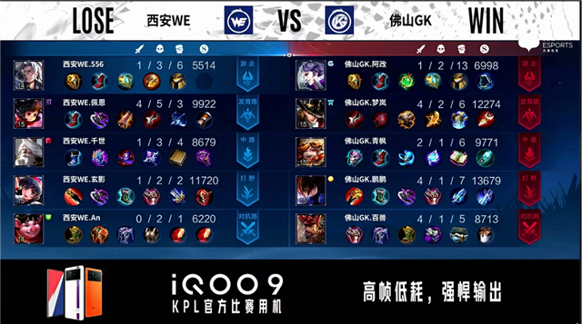 2分23秒,西安WE拿下暴君。3分20秒,佛山GK下路击杀狄仁杰拿下一血。5分10秒,中路团,佛山GK击杀张良。5分36秒,佛山GK下路击杀狄仁杰,随后破掉西安WE下一塔。5分58秒,西安WE拿下主宰。7分05秒,西安WE破掉佛山GK下一塔,随后拿下暴君。7分44秒,佛山GK中路击杀吕布。8分05秒,佛山GK破掉西安WE中一塔。10分14秒,佛山GK破掉西安WE上二塔。10分30秒,佛山GK拿下暴君,中路团,佛山GK打出0换3。11分钟,佛山GK破掉西安WE中二塔和中路高地塔。12分11秒,佛山GK拿下暗影主宰。13分02秒,佛山GK破掉西安WE下二塔。13分20秒,下路团,佛山GK打出2换4,随后破掉西安WE下路高地团。13分54秒,佛山GK击杀镜后摧毁水晶连下三城拿下本场比赛胜利。