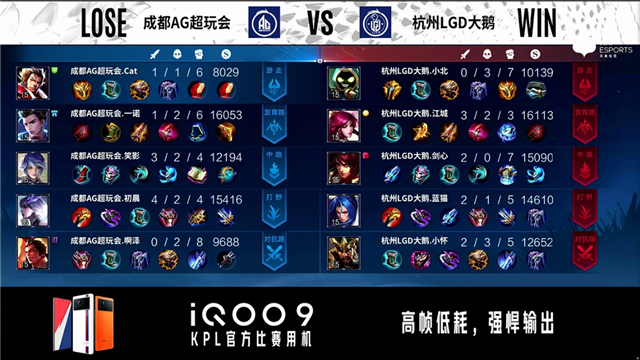 2分56秒,杭州LGD大鹅中路击杀澜拿下一血。3分55秒,成都AG拿下先知主宰。4分38秒,杭州LGD大鹅拿下暴君。5分47秒,杭州LGD大鹅破掉成都AG下一塔。6分钟,成都AG中路击杀夏侯惇,随后杭州LGD大鹅破掉成都AG下二塔。6分40秒,成都AG破掉杭州LGD大鹅上一塔。7分42秒,野区团,杭州LGD大鹅打出1换2。8分38秒,暴君团,双方1换1。9分钟,杭州LGD大鹅中路击杀蒙恬,随后杭州LGD大鹅拿下暴君。9分37秒,成都AG拿下主宰。9分56秒,野区团,杭州LGD大鹅打出0换2。10分36秒,杭州LGD大鹅拿下暗影主宰,随后成都AG拿下暗影暴君。11分35秒,成都AG破掉杭州LGD大鹅中一塔。11分50秒,野区团,双方打出2换2。12分42秒,中路团,成都AG打出0换2,随后破掉杭州LGD大鹅中二塔。14分23秒,杭州LGD大鹅拿下暗影主宰。14分42秒,成都AG拿下暗影暴君,随后团战成都AG打出2换5。15分36秒,成都AG破掉杭州LGD大鹅中路高地塔。16分40秒,成都AG破掉杭州LGD大鹅下二塔。18分11秒,成都AG拿下暗影主宰。18分50秒,成都AG拿下暗影暴君。19分22秒,下路团,成都AG击杀露娜。19分53秒,成都AG摧毁水晶扳回一局。