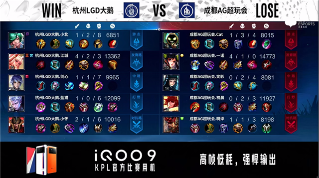 2分37秒,杭州LGD大鹅破掉成都AG上一塔。3分30秒,杭州LGD大鹅拿下先知主宰。3分50秒,成都AG拿下暴君,随后成都AG下路击杀公孙离。4分07秒,成都AG野区击杀庄周。4分40秒,成都AG破掉杭州LGD大鹅下一塔。6分13秒,双方互换边路一塔。6分34秒,中路团,杭州LGD大鹅打出0换2,随后破掉成都AG中一塔和中二塔。7分45秒,杭州LGD大鹅拿下主宰。8分12秒,杭州LGD大鹅破掉成都AG上二塔。8分50秒,杭州LGD大鹅拿下暴君,团战双方3换3。9分27秒,成都AG破掉杭州LGD大鹅中一塔。10分26秒,杭州LGD大鹅拿下暗影主宰,成都AG拿下暗影暴君,野区团,杭州LGD大鹅打出0换2。11分17秒,成都AG高地击杀公孙离。11分38秒,杭州LGD大鹅野区击杀孙尚香。13分钟,杭州LGD大鹅破掉成都AG下路高地塔。14分30秒,杭州LGD大鹅拿下暗影主宰。15分04秒,杭州LGD大鹅拿下暗影暴君。15分44秒,杭州LGD大鹅破掉成都AG中路高地塔。17分钟,杭州LGD大鹅高地击杀太乙真人。17分44秒,杭州LGD大鹅摧毁水晶拿下本场比赛的胜利。