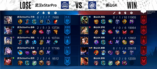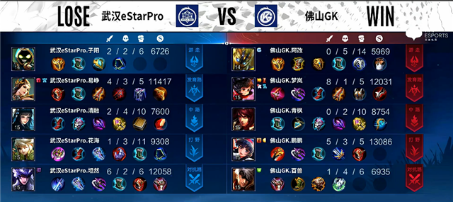 1分钟上路团战,猪八戒拿下一血,双方1换1。1分40秒上路团战,双方1换1。3分钟猪八戒被击杀。3分30秒镜拿下暴君。4分30秒蒙恬推掉上路一塔。5分钟狄仁杰被击杀。5分40秒镜拿下主宰。6分30秒蒙恬被击杀。7分钟镜拿下暴君。10分钟暴君团,武汉eStarPro打出1换2,镜拿下暴君。11分钟上路团战,武汉eStarPro打出1换2。12分30秒李元芳拿下主宰,镜推掉中路一塔。13分钟镜拿下暴君。16分钟镜拿下主宰。17分钟李元芳推掉下路高地塔。18分钟镜拿下暴君。20分钟下路团战,双方1换1。23分30秒嫦娥被击杀,李元芳推掉中路高地塔。26分钟风暴龙王团,佛山GK打出0换2,铠拿下风暴龙王。27分钟佛山GK推掉中上2路高地塔。29分钟河道团战,佛山GK打出0换3。30分钟风暴龙王团,铠抢下风暴龙王,团战佛山GK打出0换2。30分42秒佛山GK推掉水晶拿下本场比赛胜利。