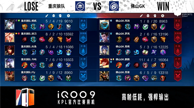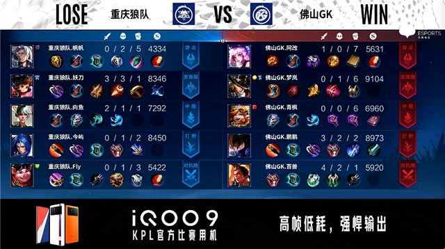 双方常规开局。2分10秒佛山GK拿下暴君。5分15秒佛山GK拿下主宰。6分33秒佛山GK拿下暴君。8分33秒佛山GK击杀马可波罗并摧毁发育路二塔。10分18秒暴君处团战佛山GK打出1换4。10分47秒佛山GK摧毁敌方中路外塔。11分16秒重庆狼队对抗路击杀伽罗。12分27秒佛山GK击杀王昭君并摧毁发育路高地塔。14分45秒暴君处团战佛山GK打出1换2。14分58秒佛山GK团灭对手,15分14秒佛山GK摧毁敌方水晶拿下比赛。