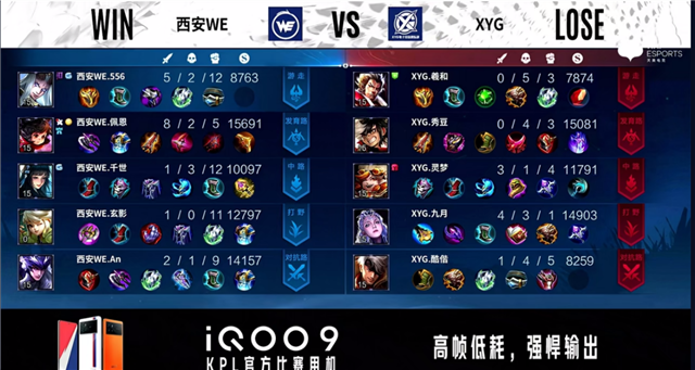 35秒,西安WE越塔击杀蒙犽拿下一血。1分钟,西安WE中路击杀张飞。2分18秒,XYG拿下暴君。3分43秒,XYG拿下先知主宰,随后中路击杀西施。5分17秒,中路团,XYG打出1换2。5分52秒,XYG破掉西安WE上一塔,野区团,西安WE击杀夏侯惇。6分56秒,西安WE拿下暴君,随后击杀张飞。8分45秒,西安WE野区击杀露娜,随后破掉XYG上一塔。10分43秒,西安WE拿下暗影暴君,随后XYG镜像拿下暗影主宰,中路团,双方1换1。11分40秒,上路团,西安WE打出1换2。13分30秒,西安WE上路击杀露娜。14分14秒,西安WE破掉XYG上二塔,随后击杀蒙犽。14分39秒,西安WE先后拿下暗影主宰和暗影暴君。15分30秒,中路团,XYG击杀马超。17分17秒,西安WE野区击杀张飞。18分09秒,野区团,XYG打出0换2。19分钟,XYG先后破掉西安WE中二塔和上路高地塔。20分钟,中路团,西安WE打出0换3,随后西安WE越塔击杀张飞和蒙犽团灭XYG。20分40秒,西安WE破掉XYG水晶拿下赛点。