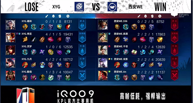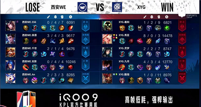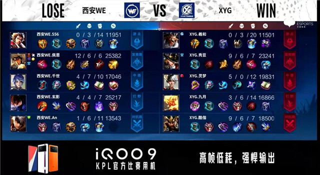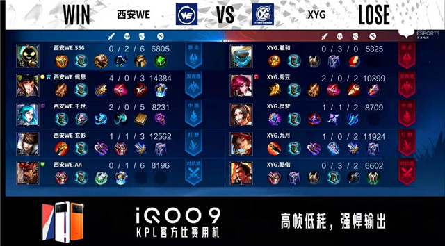 3分46秒,XYG拿下先知主宰。4分31秒,西安WE拿下暴君。5分40秒,下路团,西安WE打出0换2。6分20秒,西安WE破掉XYG下一塔。7分40秒,XYG破掉西安WE上一塔。8分18秒,西安WE拿下主宰,随后XYG破掉西安WE下一塔。8分49秒,XYG拿下暴君。10分26秒,XYG控下暗影主宰,西安WE镜像控下暗影暴君,随后中路击杀太乙真人。11分03秒,XYG破掉西安WE中一塔。12分30秒,中路团,西安WE打出1换2。13分24秒,西安WE破掉XYG中一塔。14分14秒,西安WE拿下暗影主宰,随后野区击杀盾山。14分45秒,西安WE控下暗影暴君。15分39秒,西安WE破掉中二塔。16分06秒,高地团,西安WE打出0换2,随后上路一波推掉水晶拿下本场比赛的胜利。