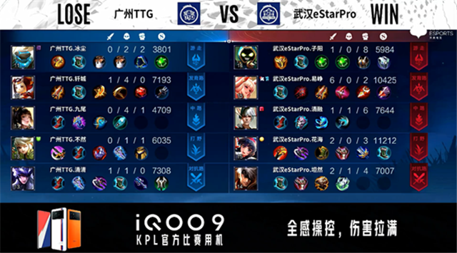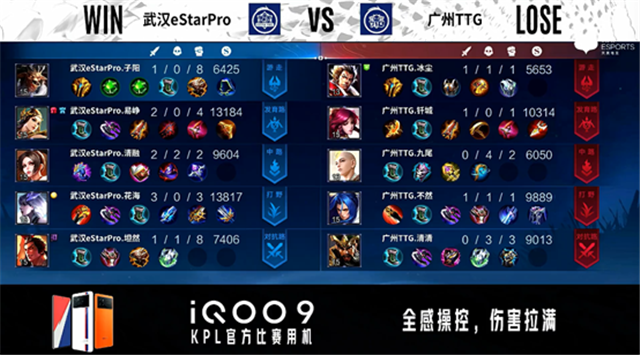开局50秒广州TTG对抗路击杀张飞拿到一血。1分18秒武汉eStar拿下中路河道之灵。1分27秒武汉eStar发育路击杀吕布拿到一血。2分20秒武汉eStar发育路击杀吕布。2分57秒武汉eStar对抗路打出0换2。3分47秒武汉eStar拿下暴君。4分25秒广州TTG野区击杀马可波罗。5分20秒武汉eStar中路击杀大乔。6分10秒双方野区1换1。7分25秒武汉eStar摧毁敌方对抗路二塔。7分46秒武汉eStar摧毁敌方中路外塔,广州TTG击杀上官婉儿。6分31秒武汉eStar拿下暴君。9分28秒武汉eStar野区击杀吕布。10分17秒武汉eStar拿下暗影主宰。11分37秒武汉eStar摧毁敌方发育路高地塔。12分52秒武汉eStar拿下暗影主宰。13分09秒武汉eStar发育路击杀大乔。13分55秒武汉eStar发育路击杀澜。14分31秒武汉eStar拿下暗影主宰。15分33秒武汉eStar摧毁敌方中路高地塔。16分50秒武汉eStar拿下暗影暴君。18分47秒武汉eStar拿下暗影主宰。19分28秒高地团战武汉eStar打出0换2。19分54秒武汉eStar摧毁敌方水晶拿下比赛。