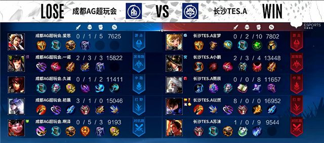 开局成都AG超玩会入侵野区拿下蓝Buff。3分钟上路团战,马可波罗拿下一血。3分20秒镜拿下暴君,澜拿下主宰。4分06秒孙尚香推掉下路一塔。5分10秒野区团战,双方2换2。7分钟野区团战,猪八戒被击杀。8分钟镜拿下暴君。10分钟中路团战,长沙TES.A打出0换2。10分28秒澜拿下主宰。11分10秒马可波罗推掉中路一塔。12分30秒澜拿下暴君。14分钟澜拿下主宰。16分55秒镜拿下暴君。17分30秒孙尚香推掉中路一塔。19分钟中路团战,马可波罗被击杀。19分33秒镜拿下主宰。20分钟孙尚香推掉上路高地塔,团战长沙TES.A打出2换5,澜拿下五杀。20分55秒长沙TES.A推掉水晶率先拿下一分。