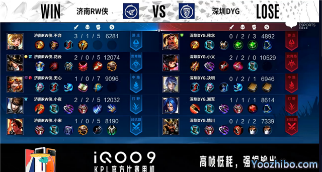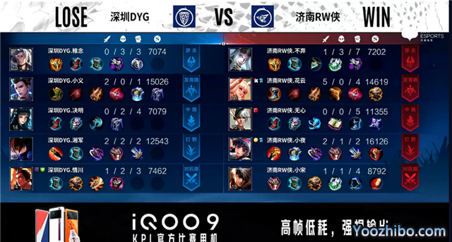 2分25秒,深圳DYG拿下先知主宰。3分49秒,暴君团,深圳DYG打出2换4。5分35秒,深圳DYG上路击杀苏烈后破掉济南RW侠上一塔。7分06秒,深圳DYG拿下主宰。9分03秒,深圳DYG拿下暴君。9分26秒,济南RW侠中路击杀沈梦溪。10分17秒,深圳DYG控下暗影暴君。10分13秒,深圳DYG破掉济南RW侠上二塔,随后控下暗影主宰。11分40秒,中路团,双方打出1换1。12分50秒,深圳DYG破掉济南RW侠下二塔。14分09秒,深圳DYG拿下暗影暴君。14分36秒,济南RW侠中路击杀梦琪。15分20秒,中路团,济南RW侠打出0换1。16分32秒,深圳DYG控下暗影主宰。17分12秒,深圳DYG破掉济南RW侠中二塔。17分40秒,深圳DYG中路击杀关羽。20分钟,野区团,济南RW侠打出0换2。20分40秒,济南RW侠下路击杀梦琪。21分10秒,济南RW侠击杀盾山后拿下风暴龙王。21分46秒,济南RW侠破掉深圳DYG下路高地塔。22分52秒,济南RW侠先后破掉深圳DYG中路高地塔和上路高地塔,随后高地团深圳DYG打出1换2。24分43秒,深圳DYG控下风暴龙王。25分19秒,高地团,深圳DYG团灭济南RW侠后推掉水晶赢得了本场比赛的胜利。