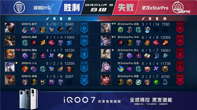 开局深圳DYG周瑜换线到对抗路。2分05秒深圳DYG下路击杀公孙离拿到一血。2分22秒武汉ES上路击杀周瑜。2分30秒深圳DYG拿下暴君。3分58秒下路团战深圳DYG打出1换2,裴擒虎拿到二连击破。5分30秒武汉ES下路打出0换2。深圳DYG裴擒虎中路单杀娜可露露。6分12秒野区团战武汉ES打出0换2,深圳DYG摧毁敌方中路外塔。6分55秒武汉ES拿下暴君。7分18秒武汉ES下路击杀梦奇。7分31秒武汉ES下路击杀裴擒虎。8分09秒武汉ES拿下主宰。9分54秒武汉ES中路击杀大乔。10分22秒武汉ES拿下暗影暴君。10分35秒武汉ES主宰处击杀梦奇。11分04秒武汉ES摧毁敌方上路二塔。11分28秒武汉ES拿下暗影主宰。12分08秒武汉ES野区击杀裴擒虎。12分17秒武汉ES摧毁敌方中路外塔。12分51秒武汉ES中路击杀周瑜。13分15秒武汉ES摧毁敌方下路高地塔。15分11秒上路团战双方1换1。16分10秒武汉ES拿下暗影主宰。18分52秒武汉ES上路击杀大乔。20分37秒中路团战武汉ES打出0换2。21分06秒武汉ES摧毁敌方水晶拿下比赛。