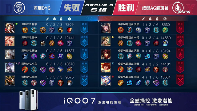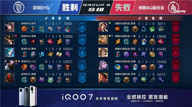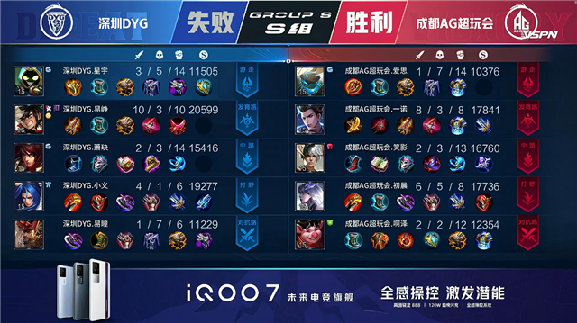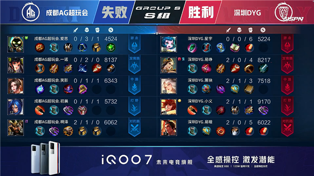 双方常规开局。1分02秒成都AG暴君处击杀张飞拿到一血。1分09秒成都AG拿到中路河道之灵。2分32秒成都AG拿下主宰。2分44秒深圳DYG拿下暴君。4分10秒成都AG击杀姜子牙并摧毁敌方下路外塔。4分51秒成都AG中路击杀姜子牙。5分14秒成都AG摧毁敌方上路二塔。6分28秒深圳DYG下路击杀虞姬。7分24秒成都AG拿下暴君。7分47秒成都AG摧毁敌方中路外塔。8分36秒野区团战深圳DYG打出1换2。9分02秒成都AG拿下主宰。10分02秒成都AG摧毁敌方中路二塔。10分15秒成都AG拿下暗影暴君。10分50秒成都AG拿下暗影主宰。12分正好深圳DYG上路击杀裴擒虎。12分20秒深圳DYG中路打出0换2。14分56秒成都AG拿下暗影暴君。15分46秒上路团战深圳DYG打出1换2。16分18秒双方中路1换1。17分33秒成都AG摧毁敌方下路高地塔。17分42秒成都AG摧毁敌方中路高地塔。18分18秒成都AG摧毁敌方上路高地塔。19分27秒野区团战成都AG打出0换3。19分55秒成都AG摧毁敌方水晶拿下比赛。